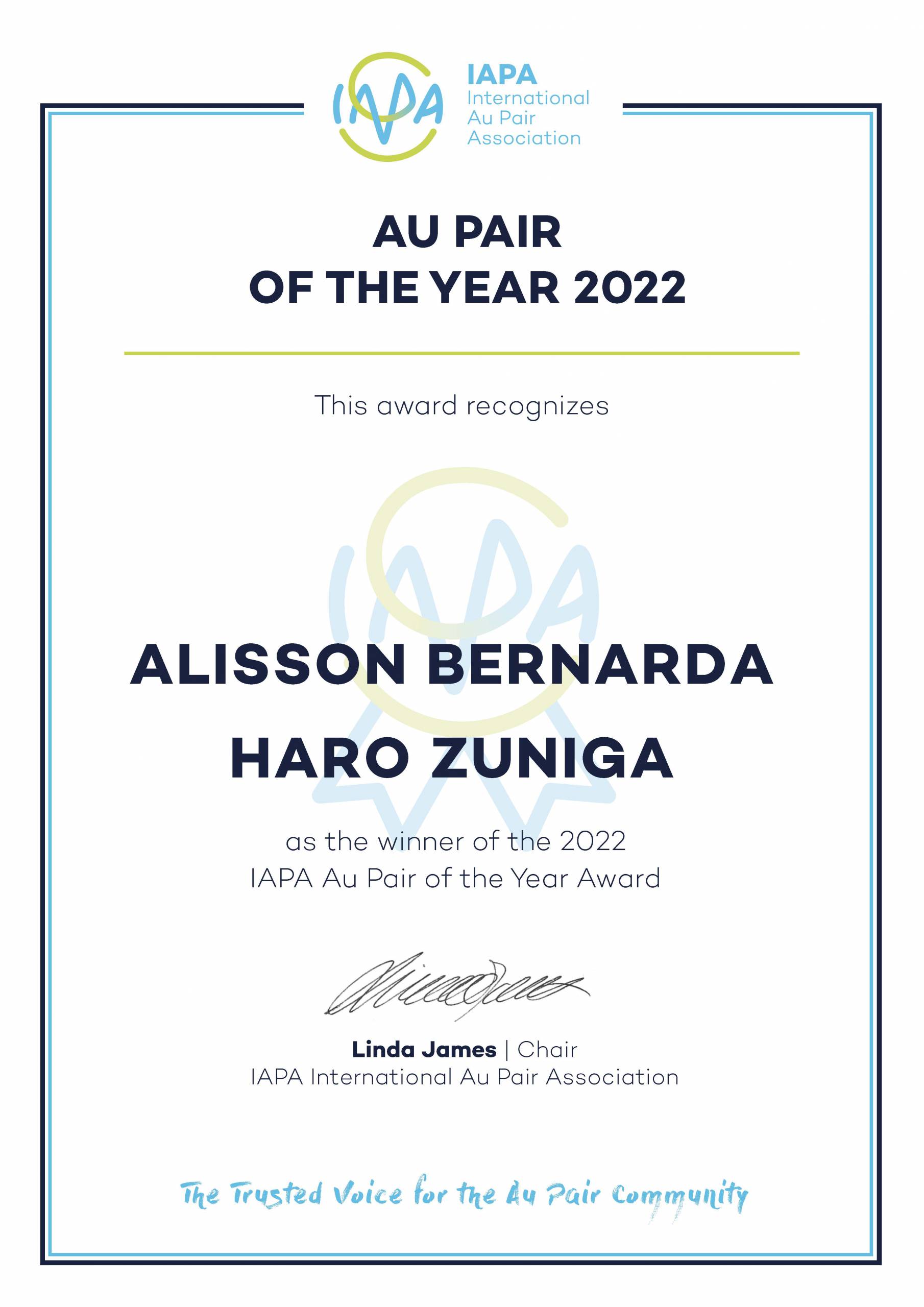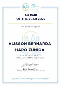 Alisson Bernarda Haro Zuniga wins IAPA´s 2022 Au Pair of the Year Award